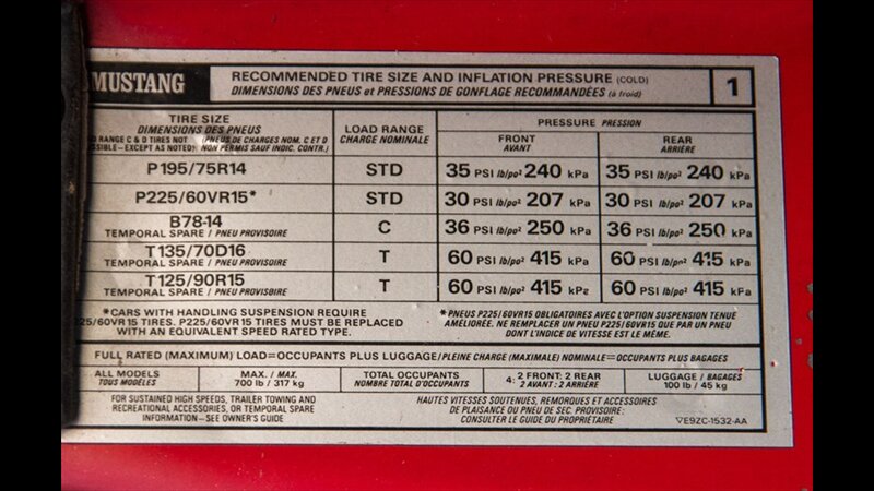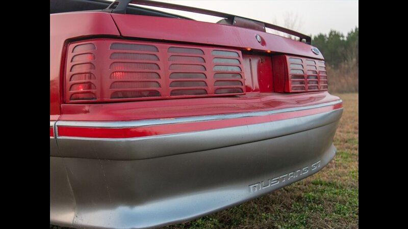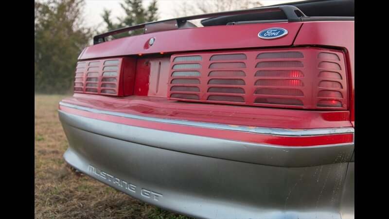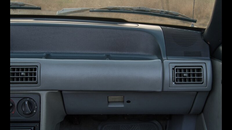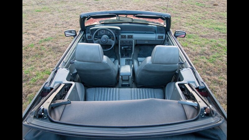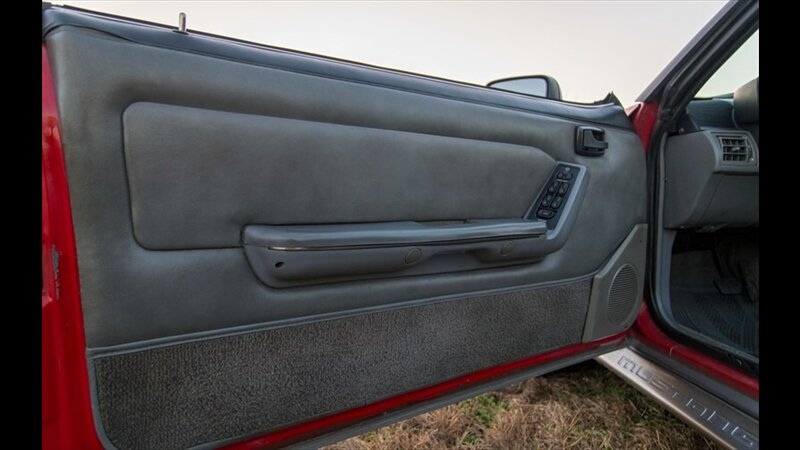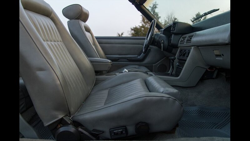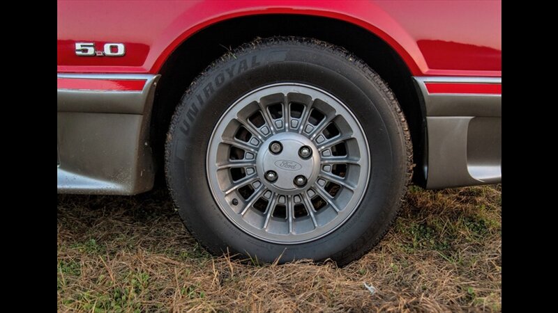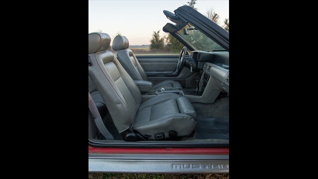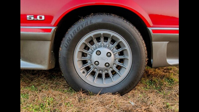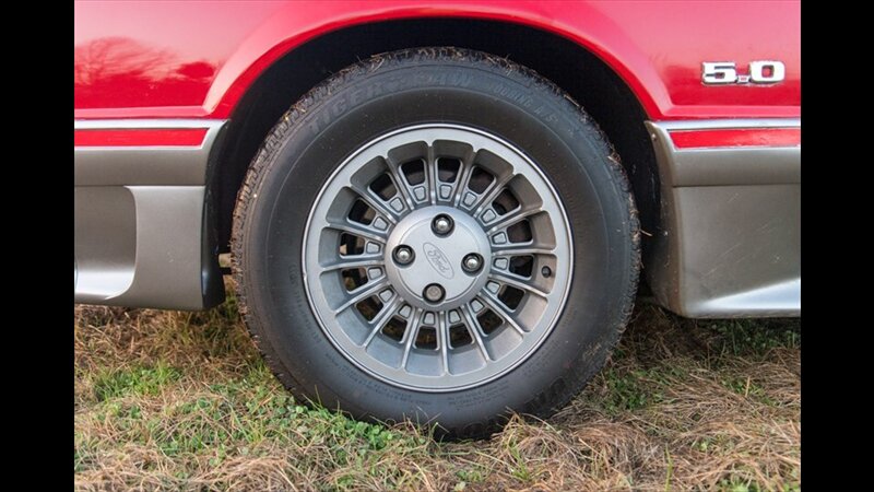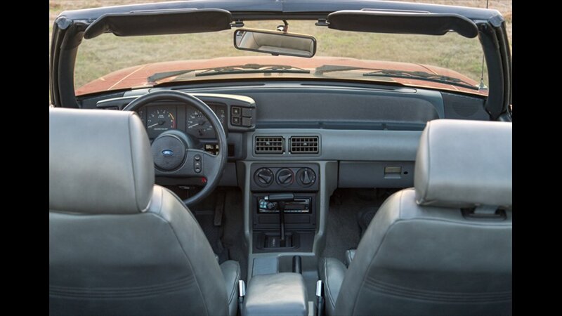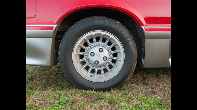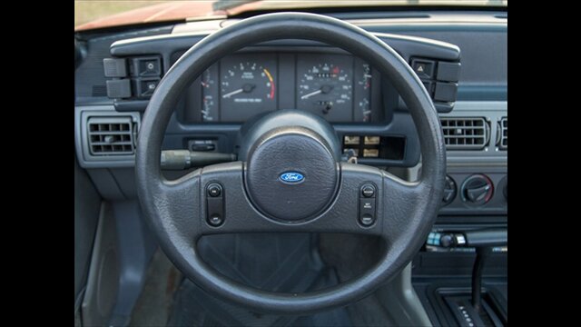 This Mustang GT features a power convertible roof, allowing you to easily enjoy top-down cruising. The exterior is enhanced by sporty ground effects/lower spoilers, giving it the aggressive stance that defined the GT model. It rides on 15-inch spoke wheels, a classic design for this era. For added convenience, it's equipped with exterior entry approach lamps and front fog lights.