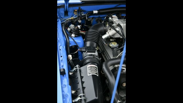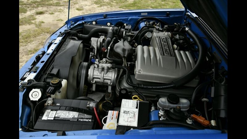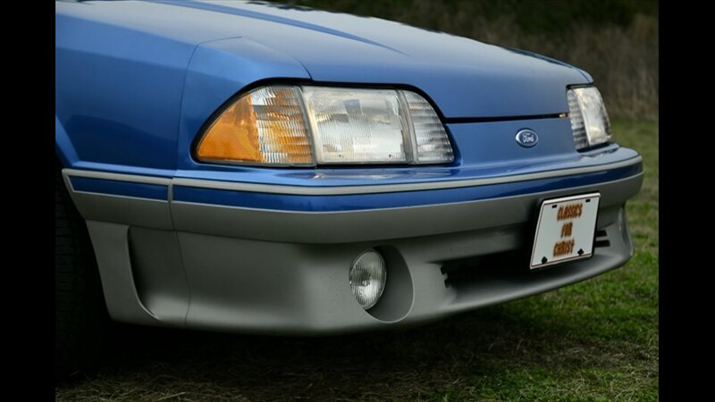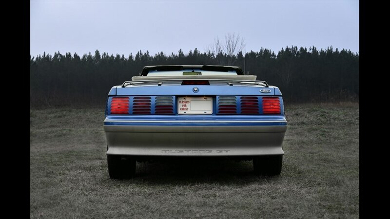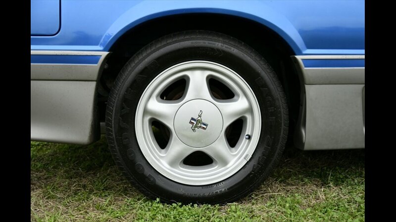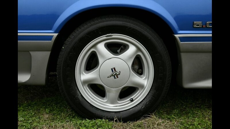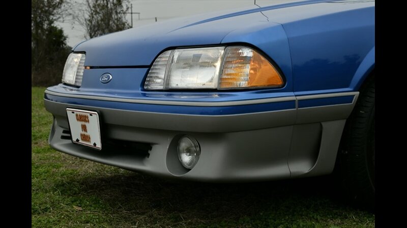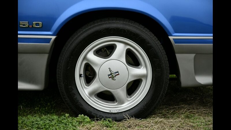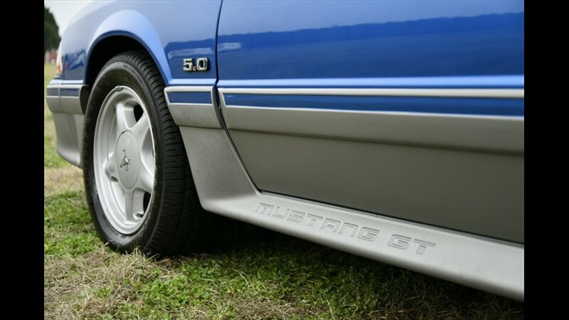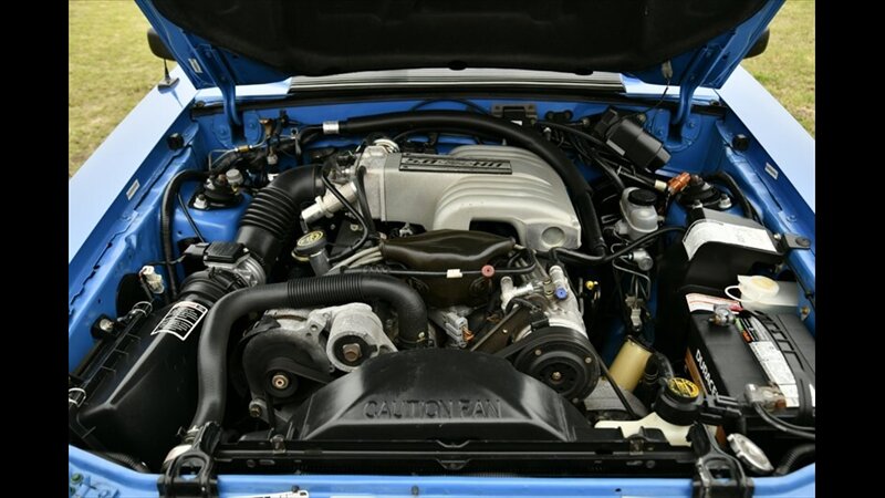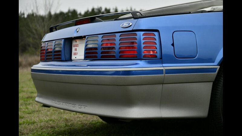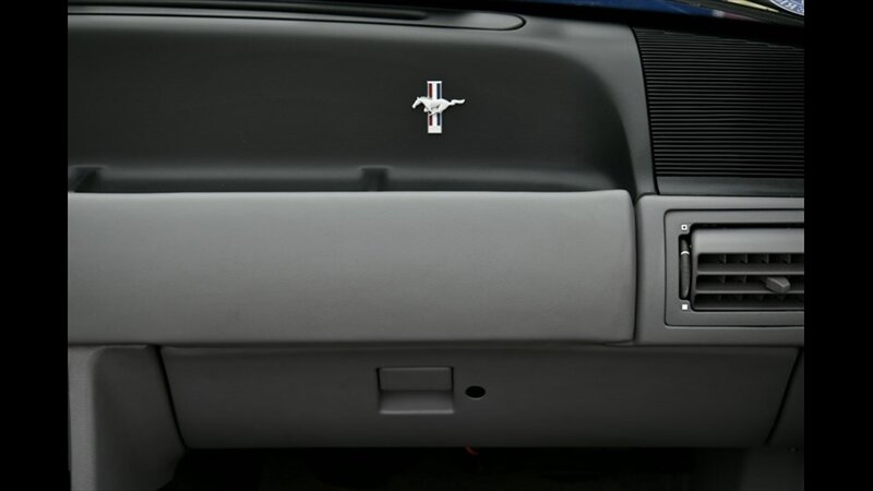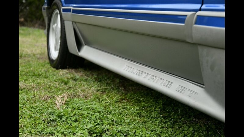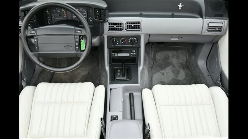This iconic Mustang GT features a power convertible top for open-air enjoyment. The exterior is enhanced by sporty ground effects/lower spoilers, giving it the aggressive stance that defined the GT model. It rides on 16-inch aluminum alloy wheels, a signature look for this generation.